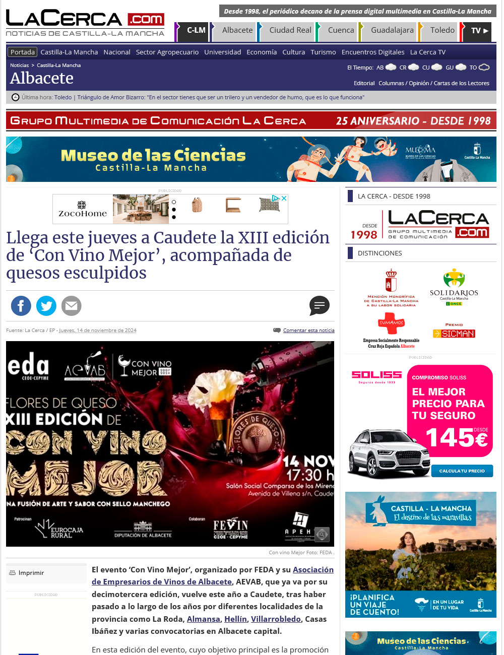 - La Cerca: Llega este Jueves a Caudete la XIII Edición de “Con Vino Mejor”, acompañada de quesos esculpidos.
