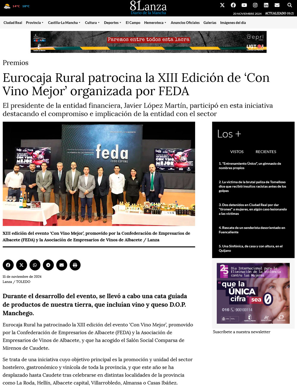 - Lanza Digital: EUROCAJA RURAL patrocina la XIII Edición de “Con Vino Mejor” organizada por FEDA.