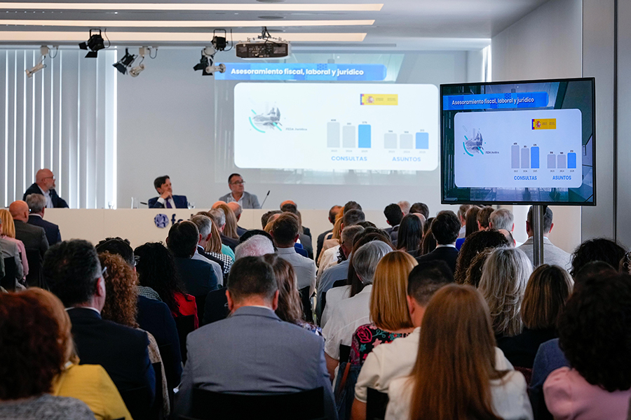El secretario general de FEDA, Vicente García, se encargó de presentar el Informe de Actividades de 2025 a través de 5 videos, realizando un recorrido por las principales gestiones, actividades, hitos y objetivos de la Confederación durante el pasado año para beneficio de empresarios, empresarias, empresas y autónomos.