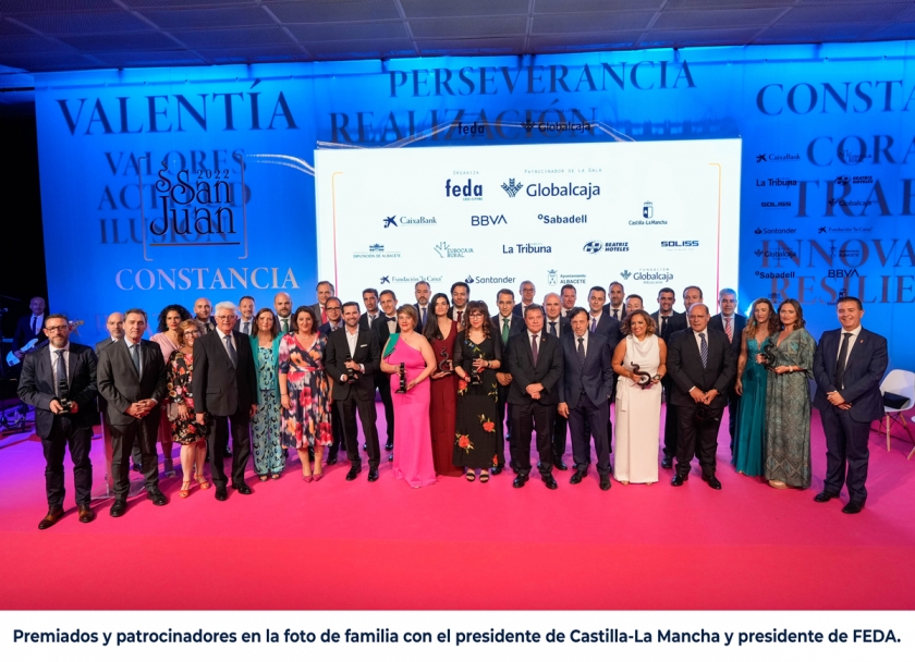 La Confederación de Empresarios de Albacete, FEDA, entregó los Premios Empresariales San Juan’2022 – XXIII Edición. Unos reconocimientos que Artemio Pérez, presidente de FEDA, calificó como “los Premios de la constancia”. El Palacio de Congresos de Albacete, lleno hasta la bandera, con una amplia representación institucional, empresarial, social y cultural de la ciudad, se vistió de gala para unos ‘Sanjuanes’ que recuperaron su esencia habitual, en una gala que, un año más, estuvo patrocinada por Globalcaja.