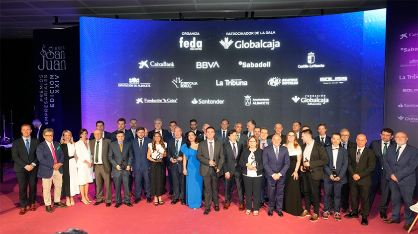 La Confederación de Empresarios de Albacete, FEDA, entregó los Premios Empresariales San Juan 2023-XXIV Edición en una Gala que puso de manifiesto, un año más, la fuerza del tejido empresarial de la provincia de Albacete. Una Gala que contó con una amplia representación institucional, empresarial, social y cultural de la ciudad, con el patrocinio de Globalcaja, presentada por la periodista Loli Ríos, que vistió un precioso vestido de la diseñadora Lola Muñoz, y amenizada por la música en directo del grupo The Gafapasta en el Palacio de Congresos Ciudad de Albacete. Y la sorpresa de la actuación del artista circense Iván Peres, que sorprendió a las cerca de setecientos asistentes.