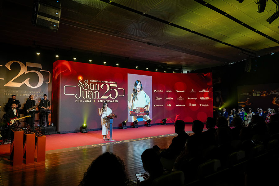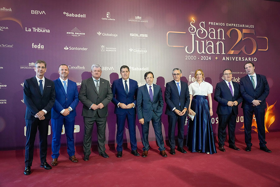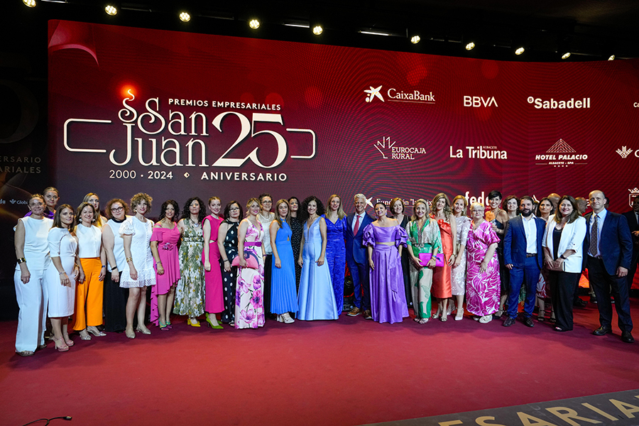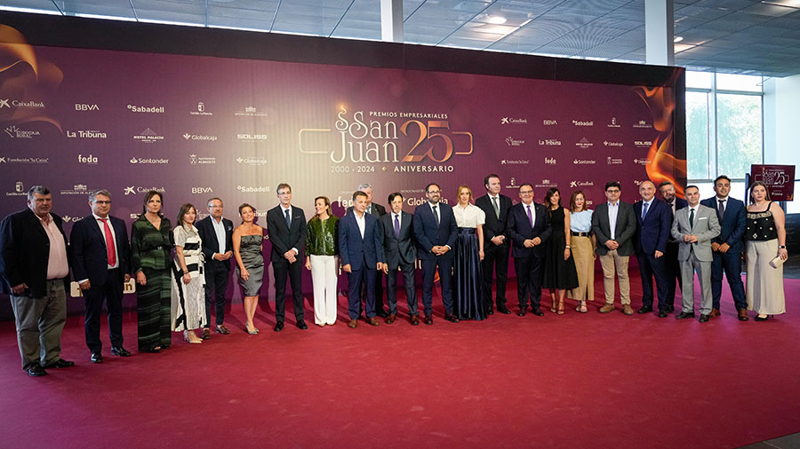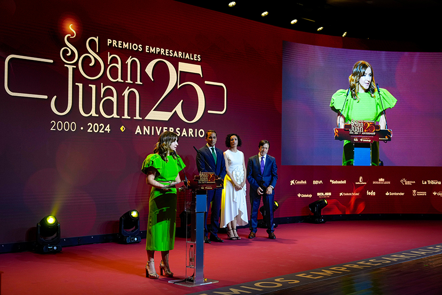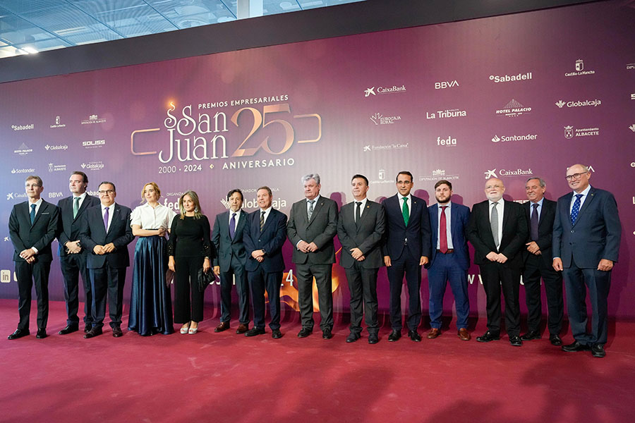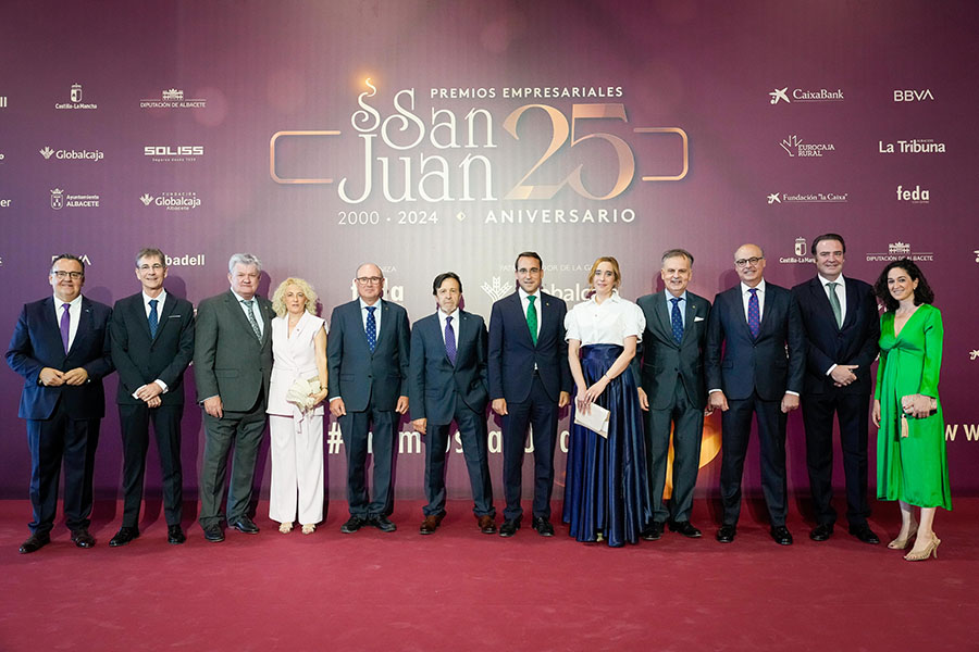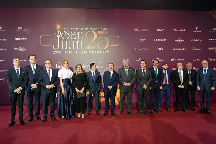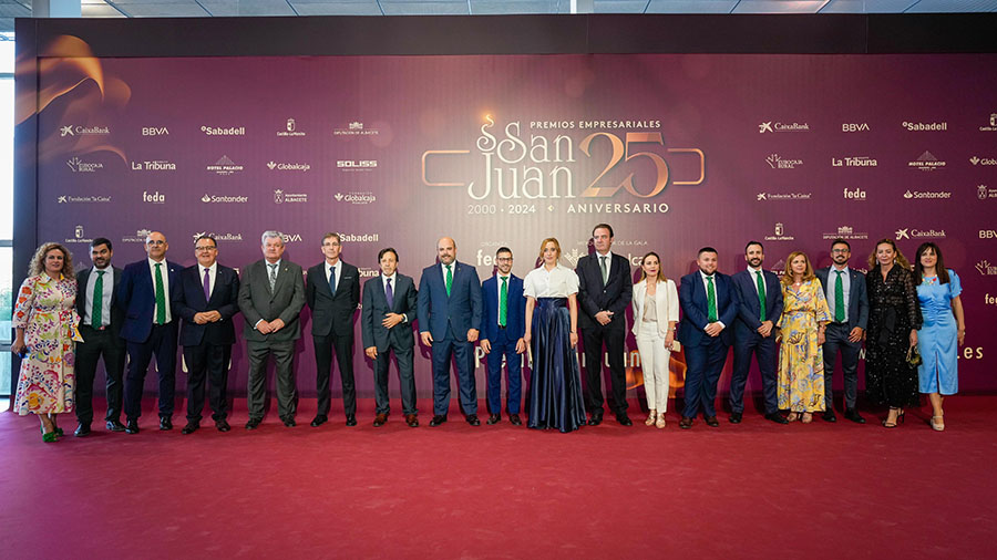 La Confederación de Empresarios de Albacete, FEDA, entregó los Premios Empresariales San Juan 2024, en su 25 Aniversario, en una Gala celebrada en el Palacio de Congresos Ciudad de Albacete, patrocinada un año más por Globalcaja. Más de 700 personas llenaron el recinto, con una amplia representación institucional, empresarial, social y cultural de la ciudad. La comunicadora Alicia Senovilla presentó el acto, vestida con un modelo de la diseñadora local Lola Muñoz y calzada con los zapatos de una de las premiadas, Ana Lucena. El grupo The Gafapasta amenizó la velada con su música en directo, en una Gala que también contó con la actuación de seis jóvenes artistas del Real Conservatorio Profesional de Música y Danza de Albacete.