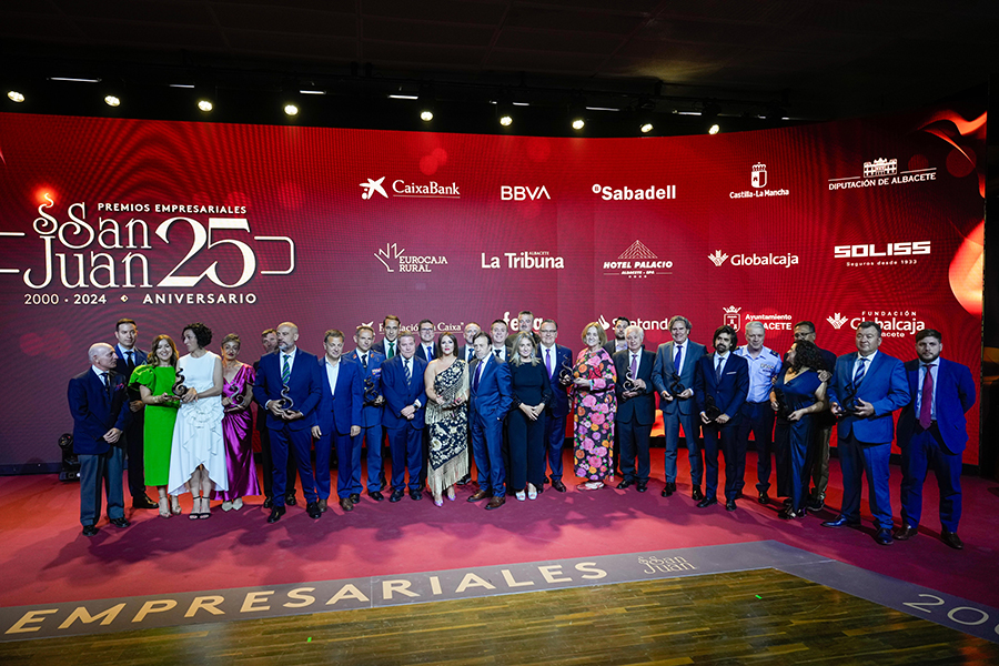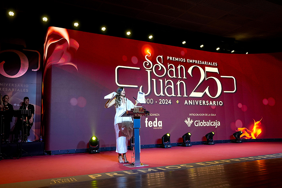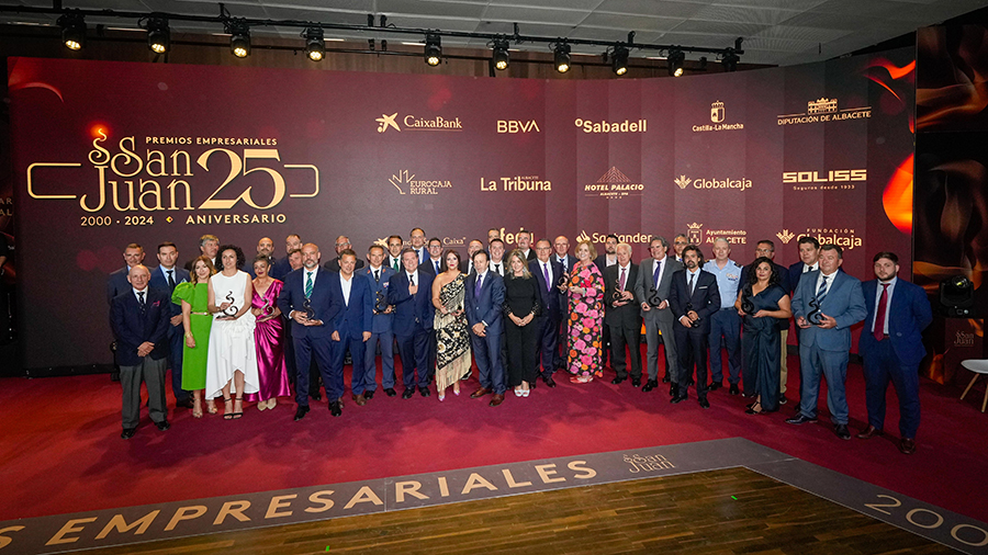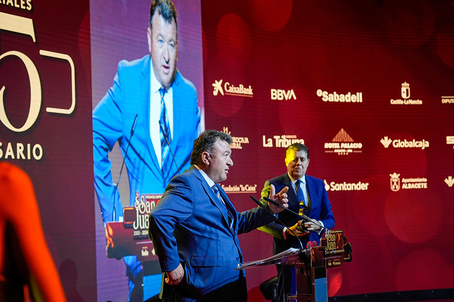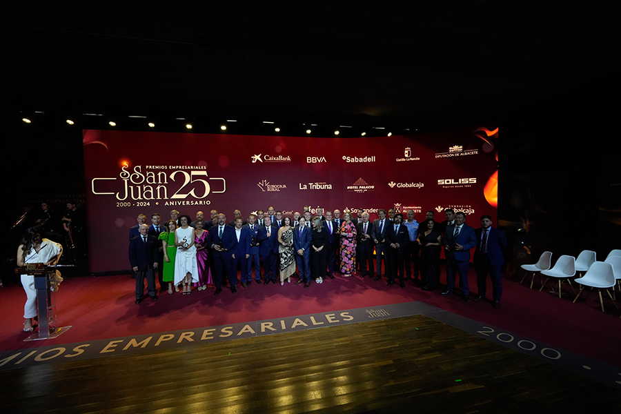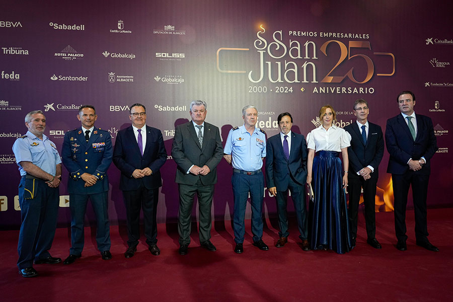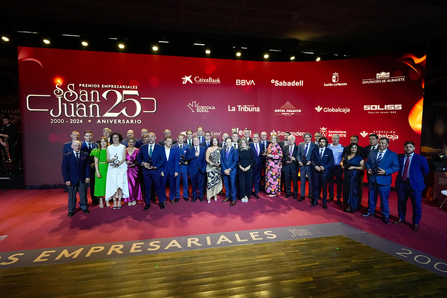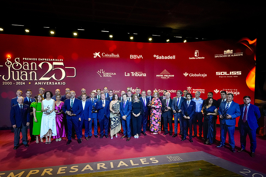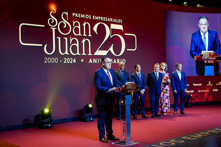 La Confederación de Empresarios de Albacete, FEDA, entregó los Premios Empresariales San Juan 2024, en su 25 Aniversario, en una Gala celebrada en el Palacio de Congresos Ciudad de Albacete, patrocinada un año más por Globalcaja. Más de 700 personas llenaron el recinto, con una amplia representación institucional, empresarial, social y cultural de la ciudad. La comunicadora Alicia Senovilla presentó el acto, vestida con un modelo de la diseñadora local Lola Muñoz y calzada con los zapatos de una de las premiadas, Ana Lucena. El grupo The Gafapasta amenizó la velada con su música en directo, en una Gala que también contó con la actuación de seis jóvenes artistas del Real Conservatorio Profesional de Música y Danza de Albacete.