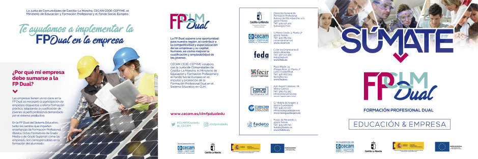 La Confederación de Empresarios de Albacete, FEDA, trabaja en el impulso de la Formación Profesional Dual en la provincia de Albacete con acciones y captación de proyectos entre las pymes, gracias al acuerdo alcanzado entre CECAM CEOE CPYME Castilla – La Mancha y el Gobierno Regional y financiado por el Ministerio de Educación y Formación Profesional y por el Fondo Social Europeo.