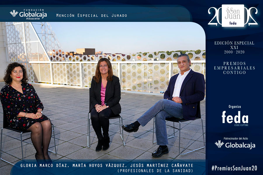 - Queremos personificar, a todos ellos, en ALBERTO SANSÓN JUSTEL, director médico de la Gerencia de Atención Integrada de Albacete; MARÍA HOYOS VÁZQUEZ, directora de Gestión y Servicios Generales de la Gerencia de Atención Integrada de Albacete; GLORIA MARCO DÍAZ, directora de Enfermería de la Gerencia de Atención Integrada de Albacete y JESÚS MARTÍNEZ CAÑAVATE, director médico de Quirón Salud Albacete y Quirón Salud Santa Cristina.