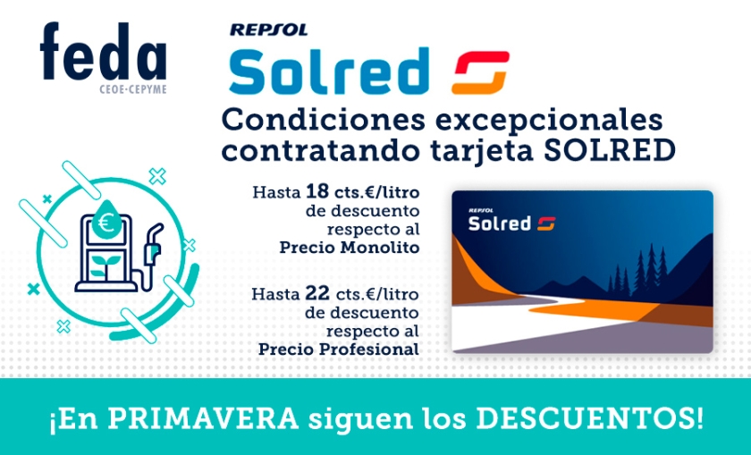 PRECIO MONOLITO. Acuerdo FEDA. Solred en diesel E+ y E+10 (desde, 7 cts./€ hasta 18 cts./ € litro, en más de 2000 EE.SS), así como gasoleo bonificado (hasta 5 cts./€ litro), AdBlue (hasta 20 cts./€ litro) y gasolina 1,20 cts. /€ litro.