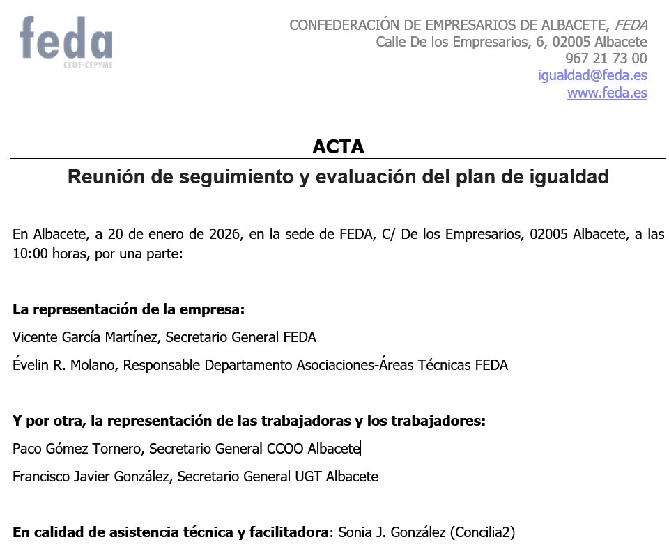 Esta comisión de seguimiento está compuesta por Vicente García, secretario general de FEDA, y Évelin R. Molano., responsable del Departamento de Asociaciones, Áreas Técnicas y Proyectos, ambos en representación de la Confederación, y por Paco gomez tornero, secretario general de CCOO Albacete, y Francisco Javier González, secretario general de UGT Unión General de Trabajadoras y Trabajadores Albacete, en representación de la plantilla.